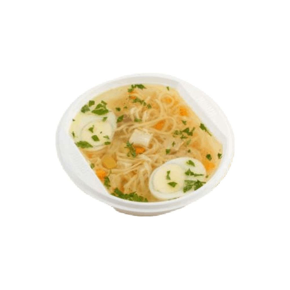 В составе: Насыщенный куринный бульон, мясо курицы, варенные яйца, картошка, морковь, зелень
