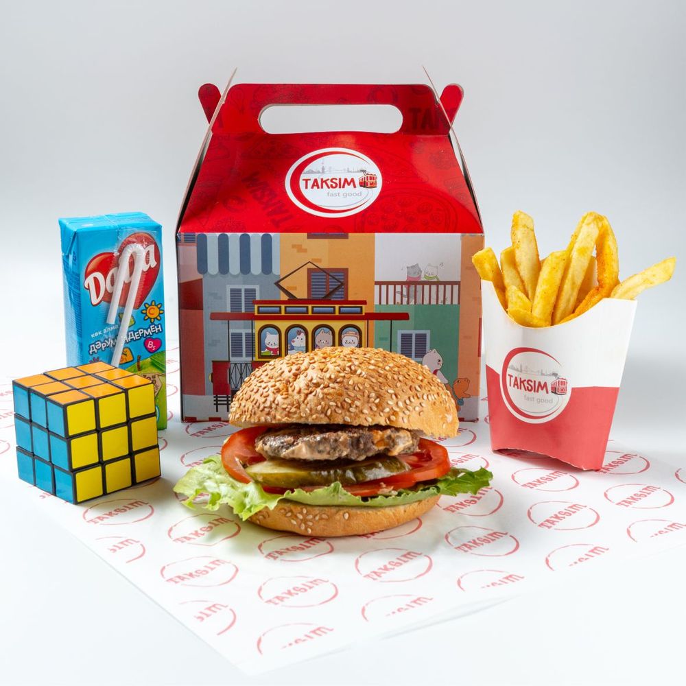 В составе: Мини булочка бургер, котлета говядины с бараниной, салат айсберг, свежие помидоры, маленький картофель фри, сок дада 0,2л, игрушка