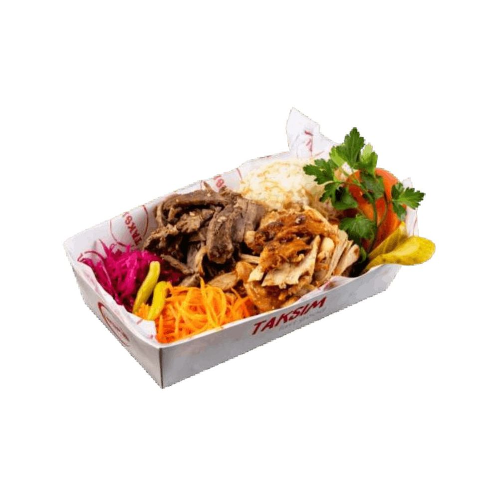 В составе: Мясо нарезка баранины, говядины и курицы, салат из маринованной моркови, красная капуста маринованная, маринованный огурец, свежие помидоры, зелень, лаваш, рис по турецки, перец халапенью
