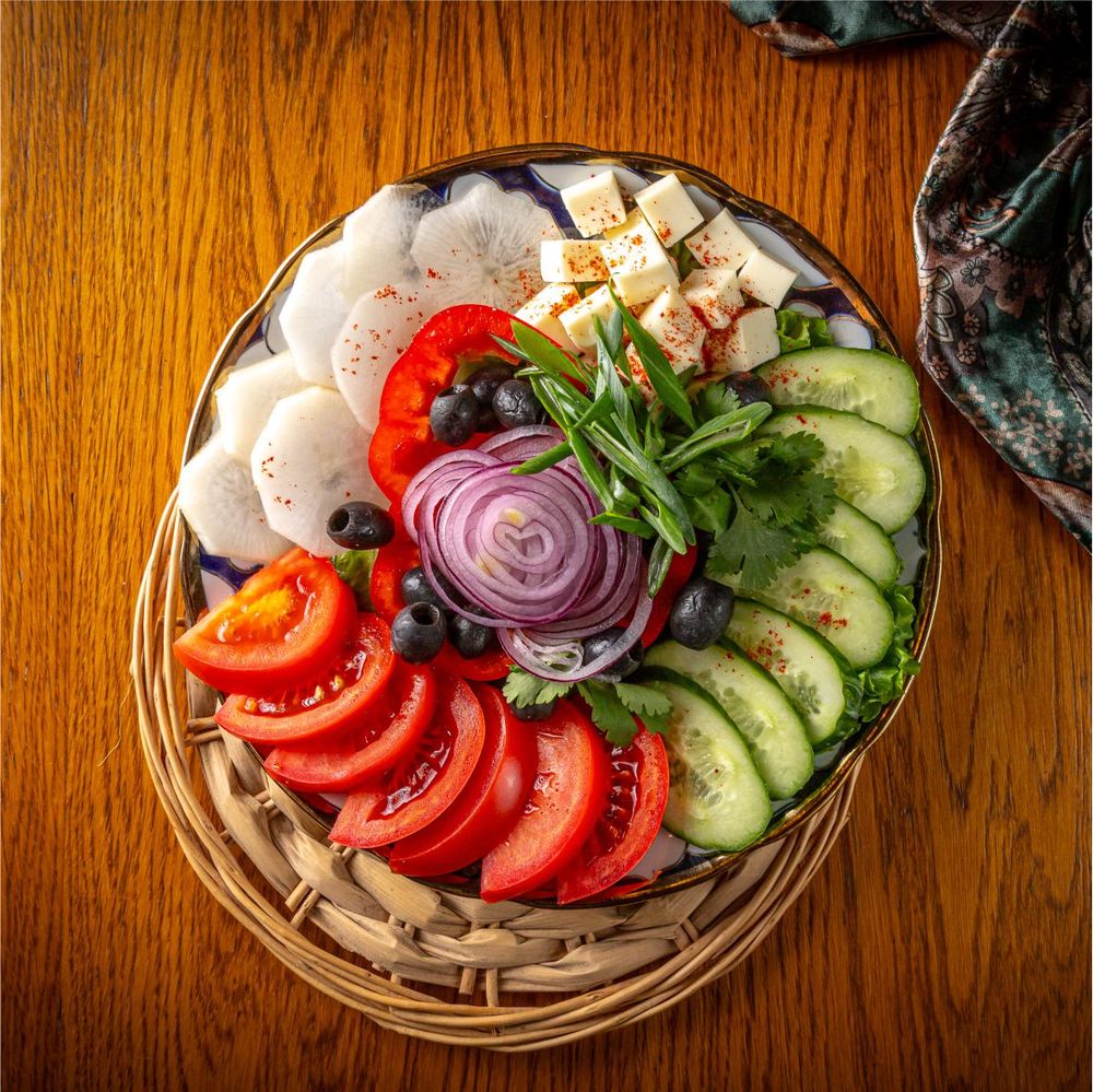 Помидор,Огурцы,Болгарский перец,Маслины,Дайкон подается с сыром фетакса и украшается петрушкой,укропом и зеленым луком. 380 гр