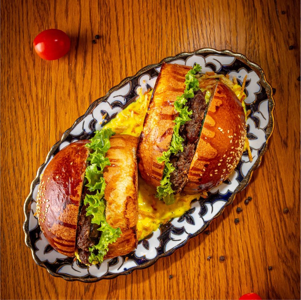 Говяжья сочная котлета, лист салата, соленые огурцы, помидор, айсберг, фри, лук жареный, сырный соус и фирменный соус для бургера 250/50гр
