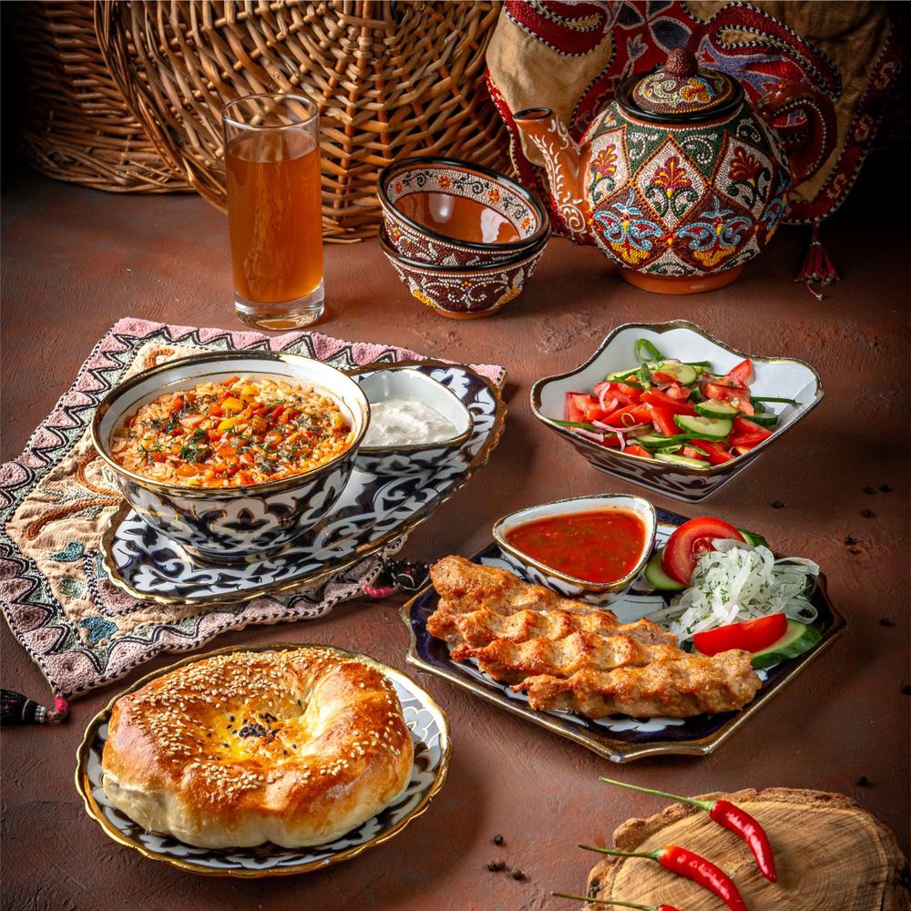 Салат шакароб, суп мастава, люля кебаб из курицы, лепешка узбекская, компот