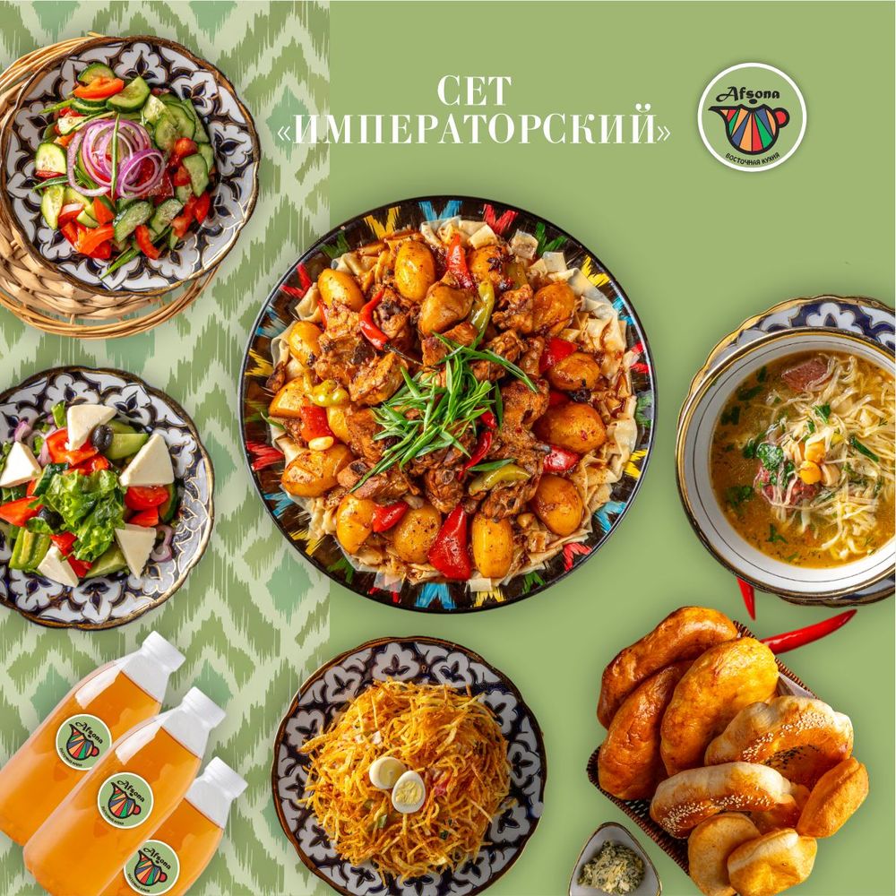 Дапанджи на 6 персон Салаты:Шакароб-2порц,Греческий-1порц,Санат-1порц, Суп лапша с бараниной-6порц Нан-Дастархан Компот сухофрукт-3литр