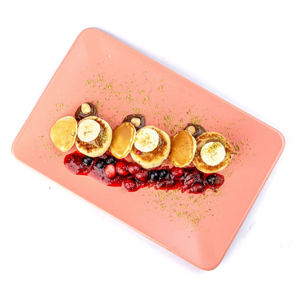 Сырники, мини панкейки, ягодный соус, карамель, паста нутелла, фисташка, банан. 180 гр
