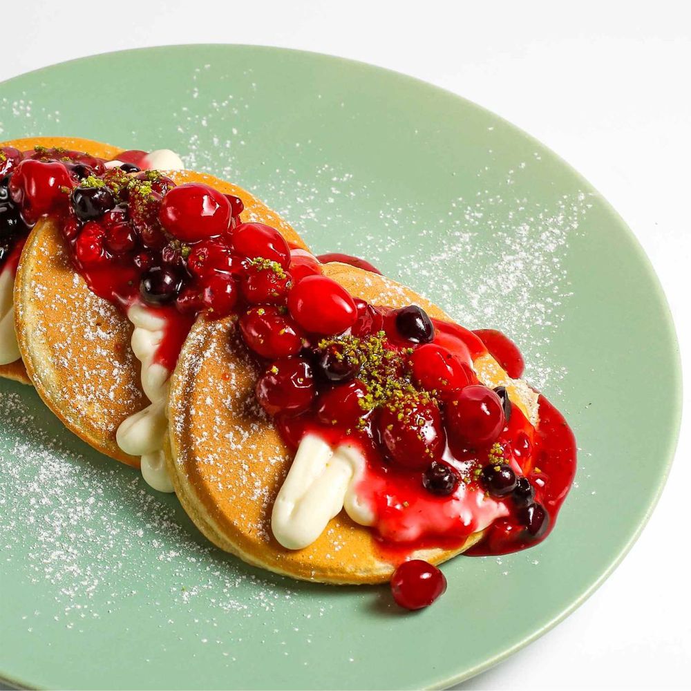 Панкейк, заварной крем, соус из лесных ягод, клубника 180 гр