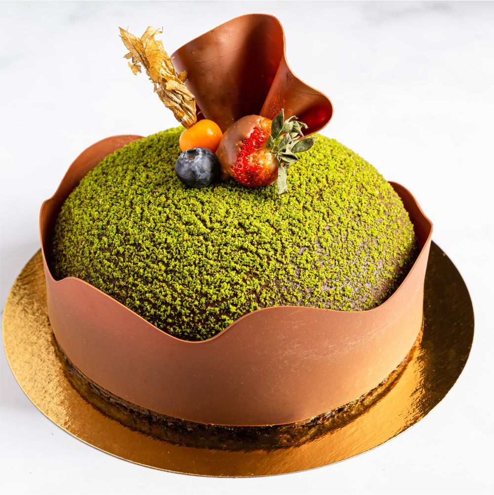 В составе: Шоколадный бисквит, шоколадный соус, заварной крем на основе молочного шоколада. Начинка клубника и малина, шоколадный ганаш. Покрытие с шоколадной глазурью и дробленными фисташками.