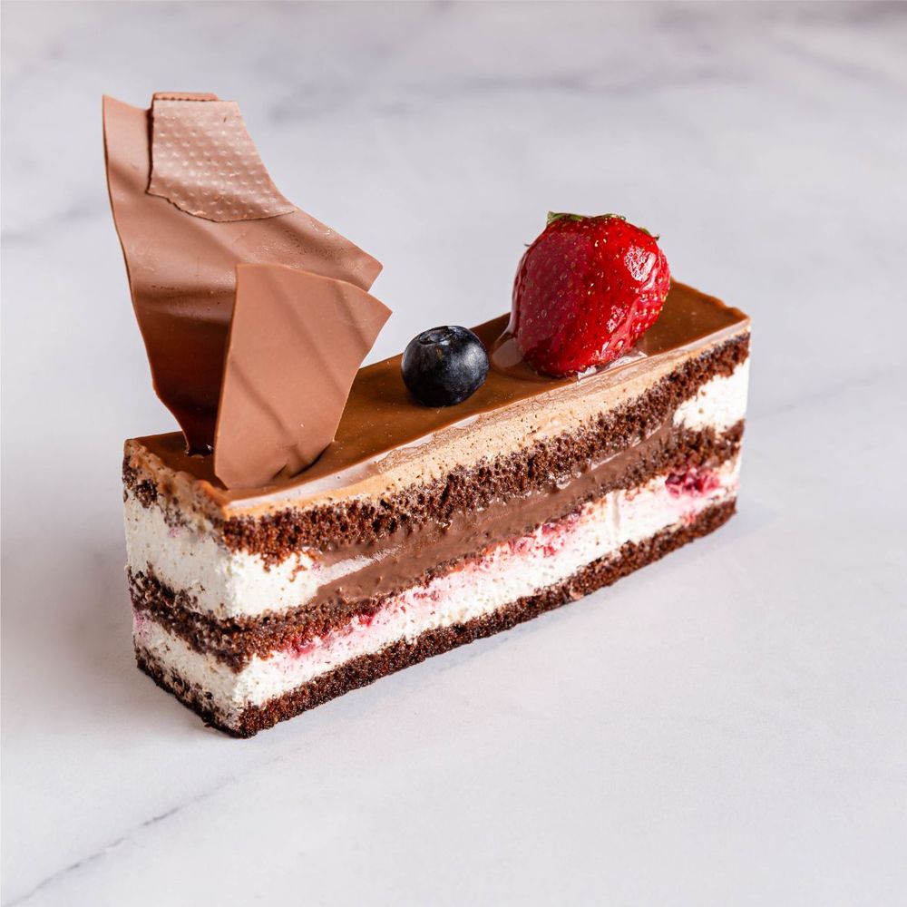 В составе: Шоколадный бисквит, заварной крем, шоколадный соус, малина, смородина