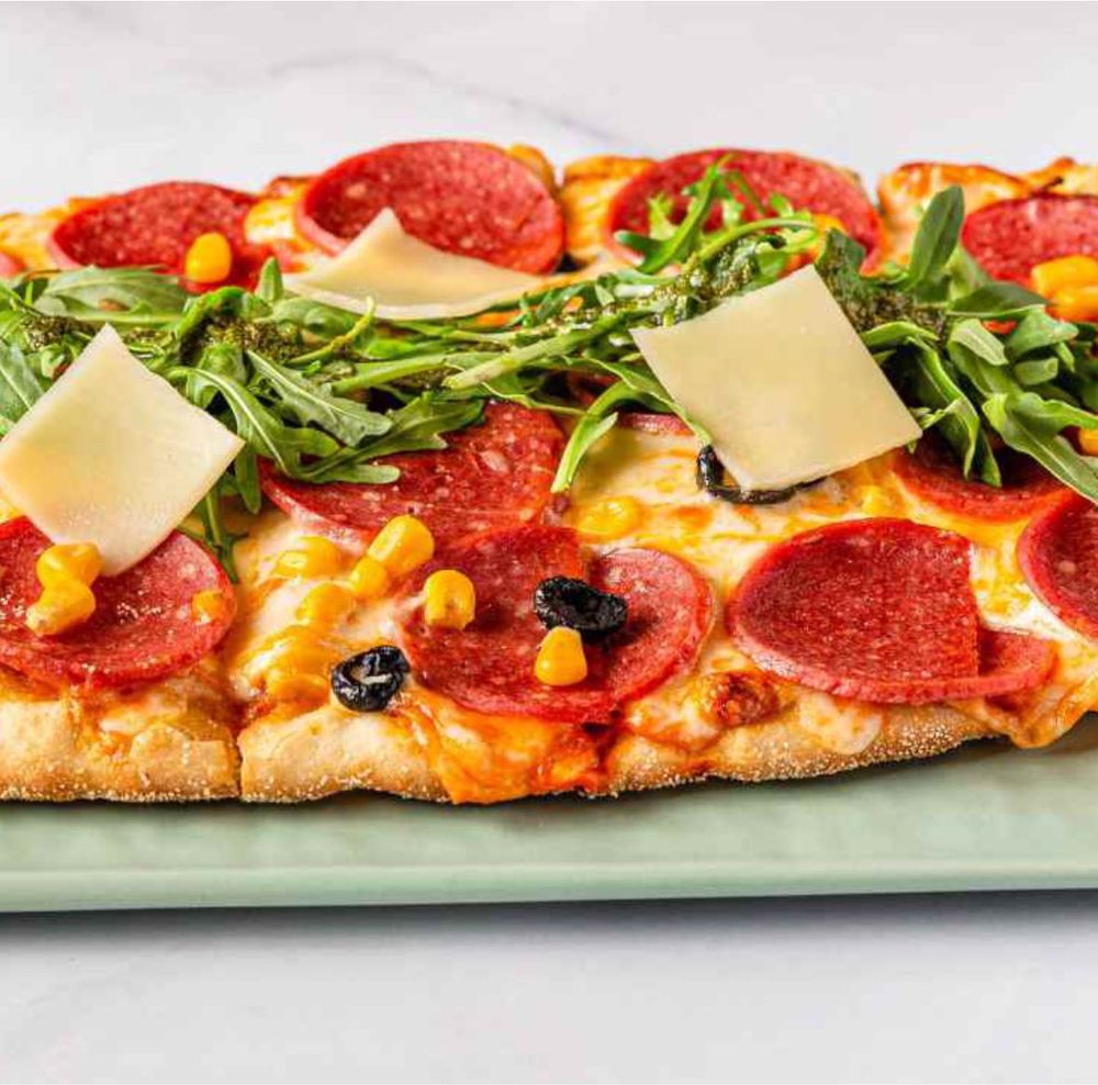 Пицца соус, сыр моцарелла, колбаски пепперони, кукуруза, маслины, руккола, оливковое масло, соус песто 420 гр