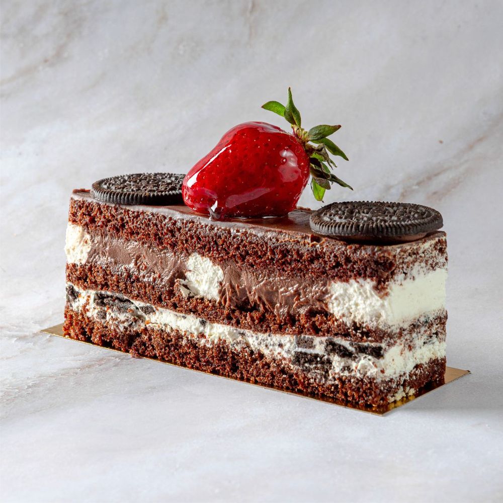 В составе: бисквит шоколадный, заварной крем, печенье орео, свежая клубника