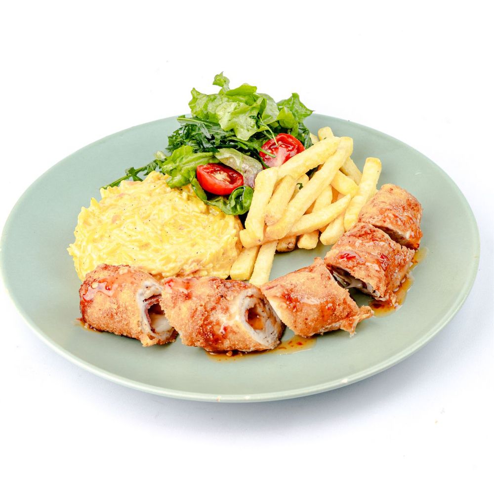 Рулет из куриной грудки, ростбиф, сыр моцарелла, ризони, фри, микс салата 440 гр