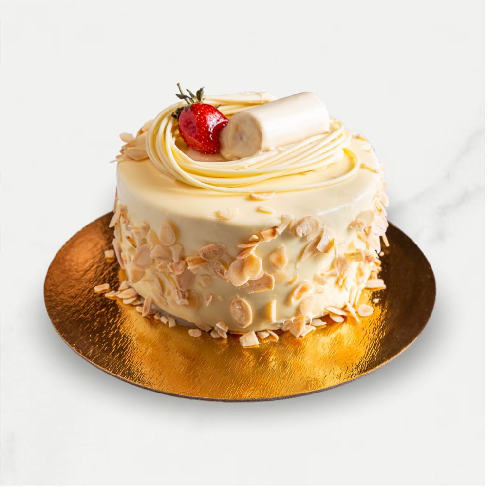 В составе: Белый бисквит, ванильный крем, банан, клубника и миндальные лепестки, шоколадный ганаш