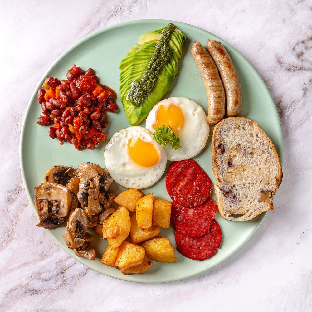 Яйцо глазунья, авокадо, хлебное ассорти, пепперони, куриные колбаски, соте из картофеля, грибов и фасоли 480 гр