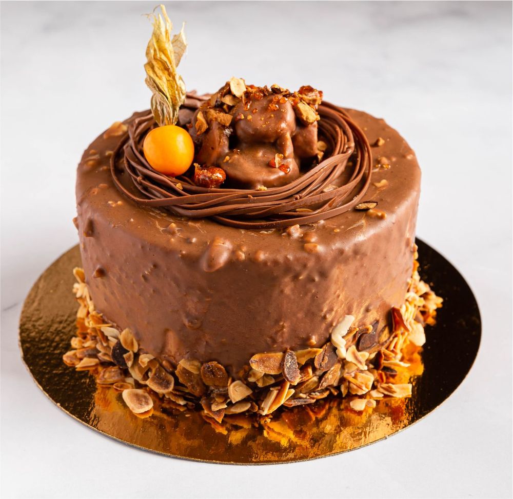 В составе: шоколадный бисквит, шоколадный ганаш, белый заварной крем, молочный шоколад, соленый арахис, миндальные лепестки, физалис