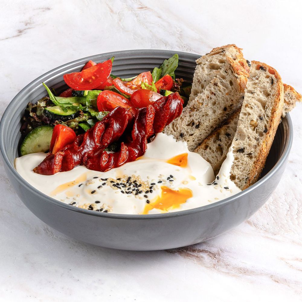 Йогурт, яйцо пашот, охотничьи колбаски, хлебное ассорти, микс салата, кунжут, специи и красное масло 320 гр