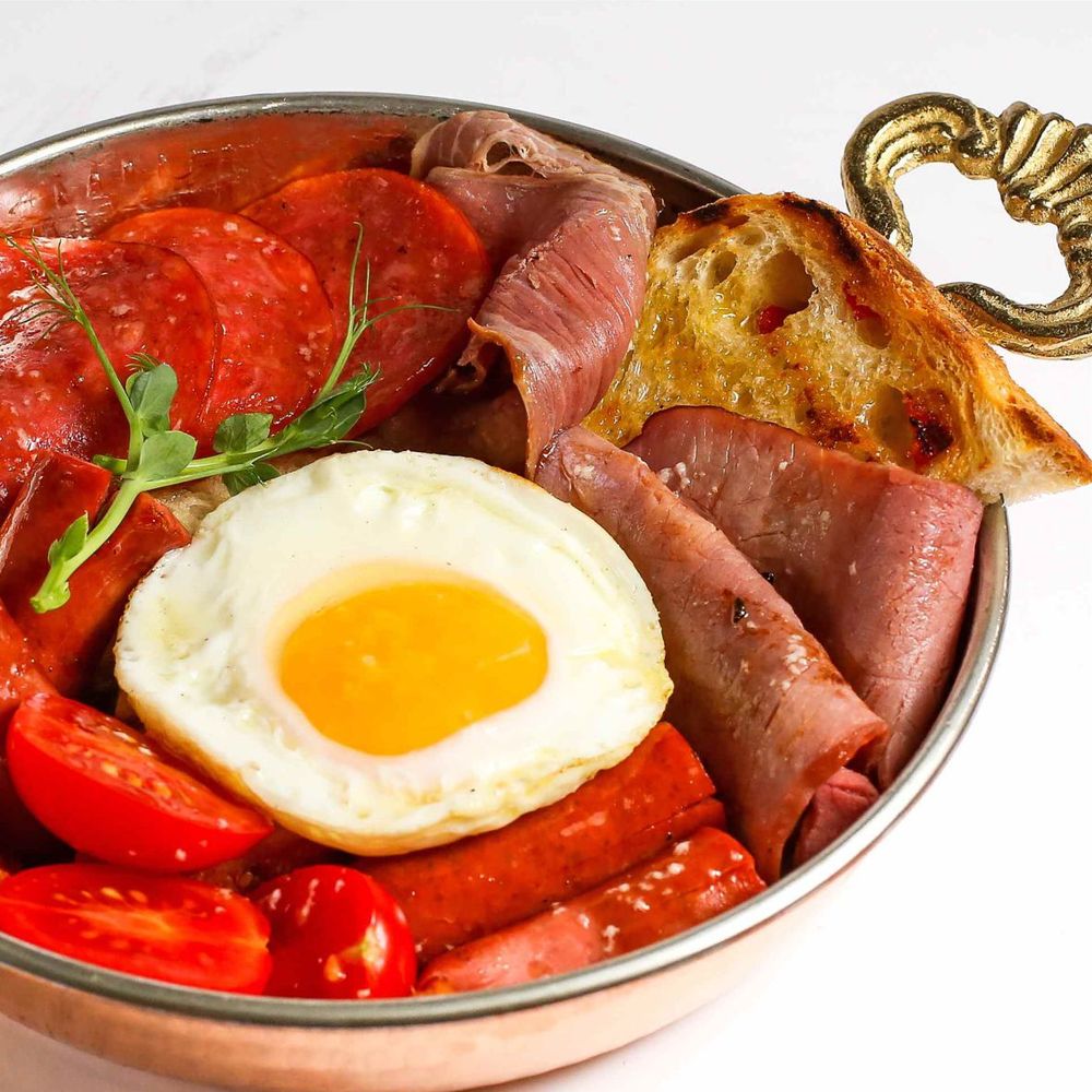 Хлебное ассорти, пепперони, ростбиф, охотничьи колбаски, куриные колбаски, говяжий бекон, черри, яйцо глазунья 380 гр
