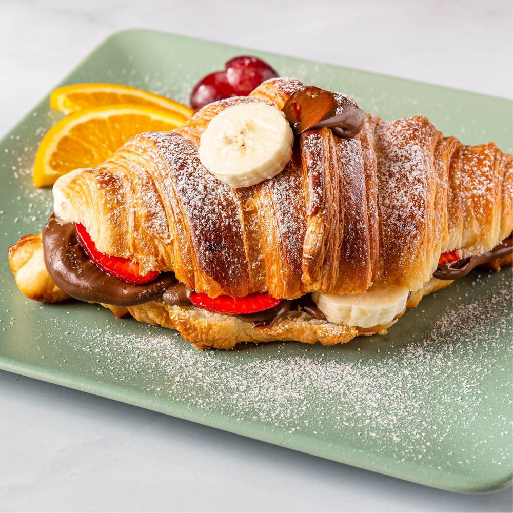 Классический круассан из собственной пекарни, крем нутелла, крем заварной, апельсин, банан, виноград, клубника 240 гр