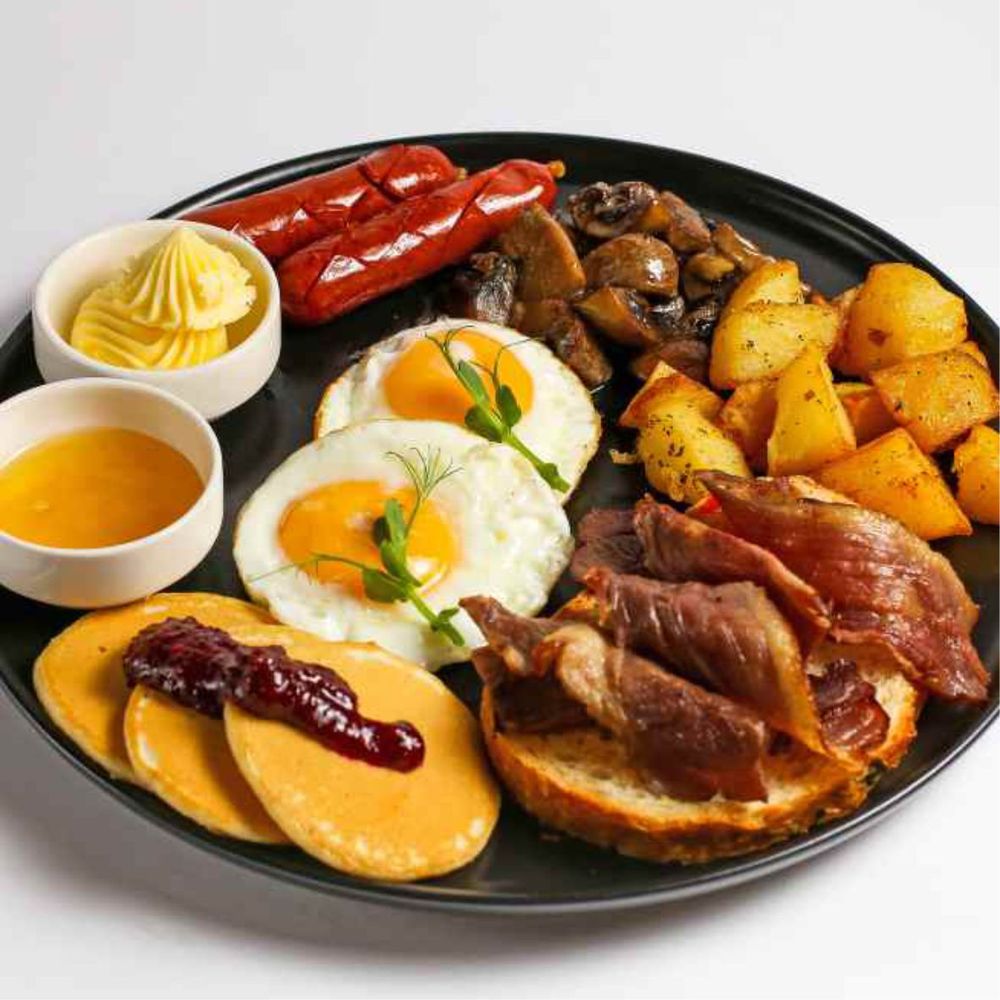 Панкейки, охотничьи колбаски, ростбиф, яичница, мед, сливочное масло, грибное и картофельное соте 480 гр