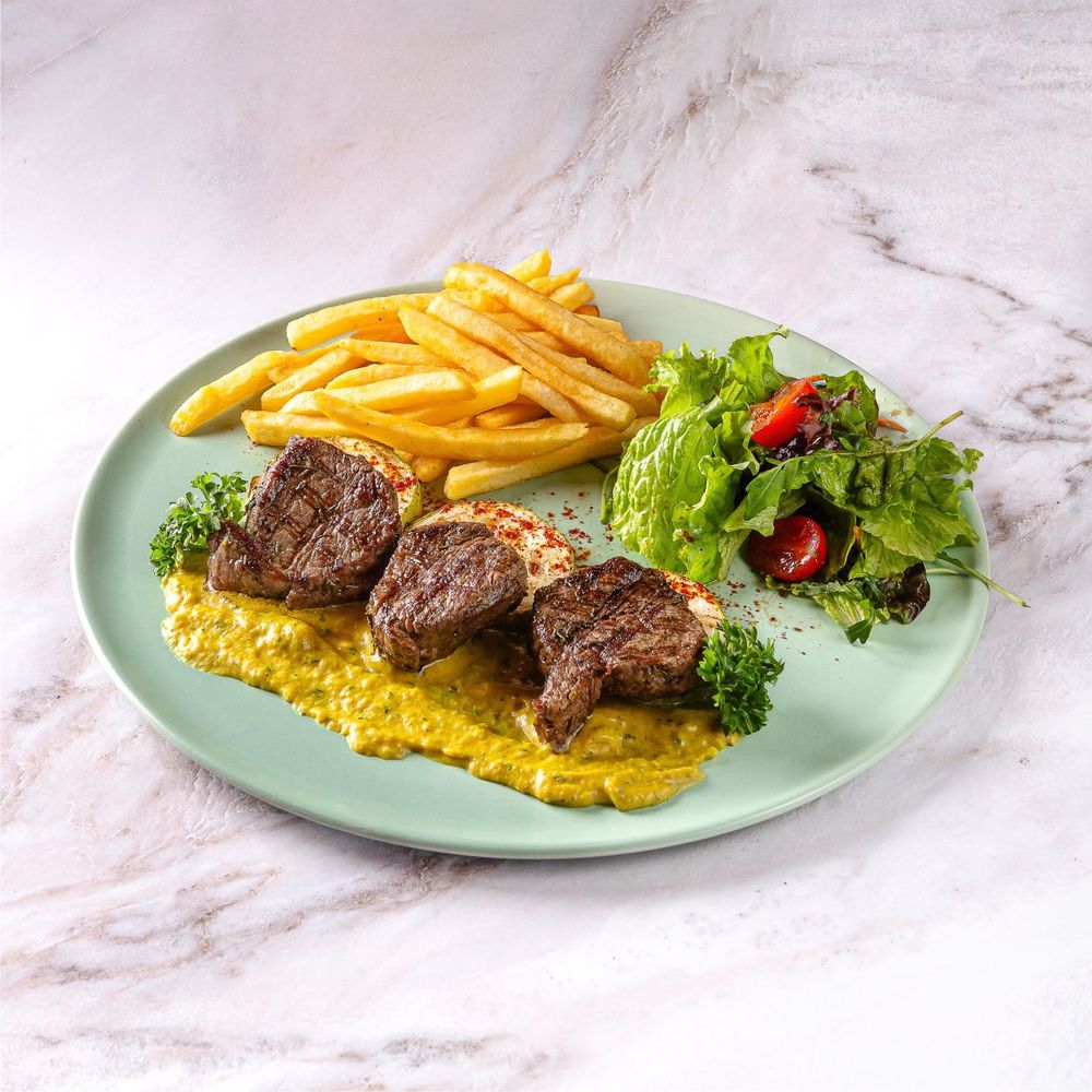 Нежные медальоны из вырезки телятины на фирменном соусе, гарнируется микс салатом и картофелем фри 420 гр