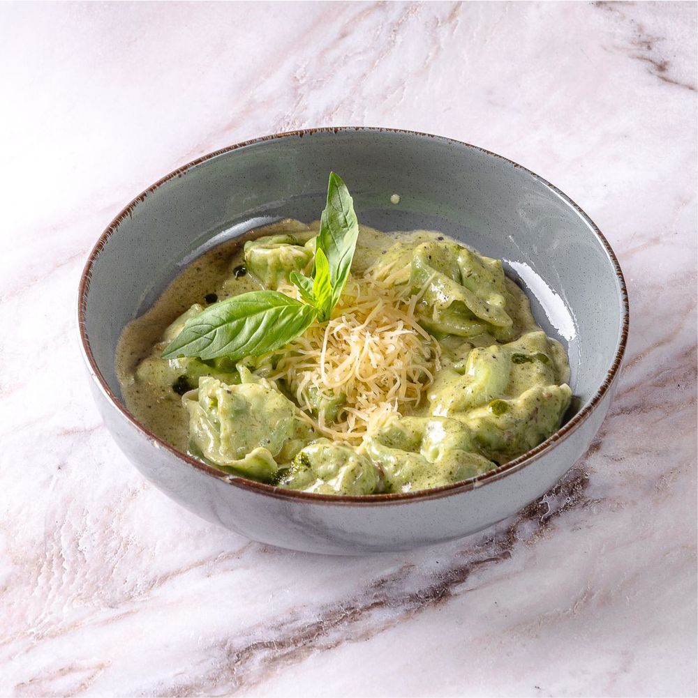 Равиолли со шпинатом и 3-х сыров под сливочно - грибным соусом. Укрошается тертым пармезаном, базиликом и соус песто 300 гр