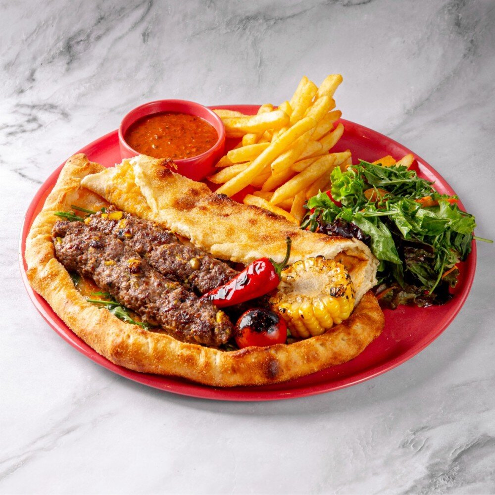 Рубленное мясо баранины и телятины с фисташками в панзаретти, микс салата, картофель фри, кукуруза в початке, соус пери пери 420 гр