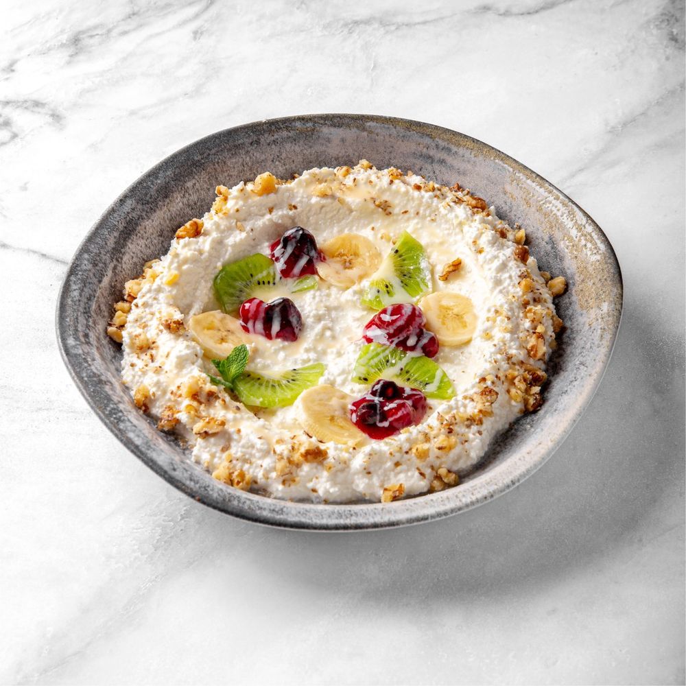 Творог, грецкий орех, варенная сгущенка, клубника, банан, киви, мята 300 гр